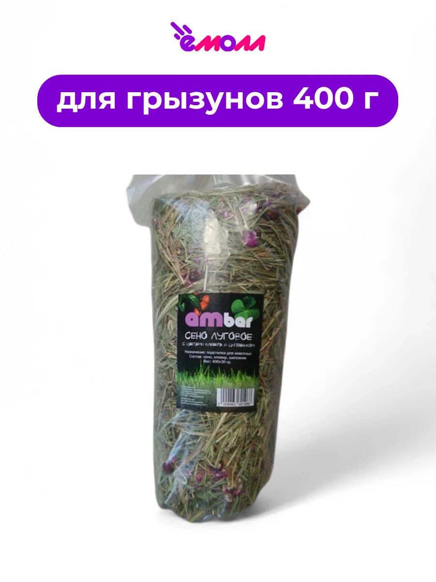 Сено "Ambar" с цветами клевера и шиповника — это натуральный корм для грызунов, который сочетает в себе высококачественное луговое сено с добавлением ароматных цветов клевера и шиповника.