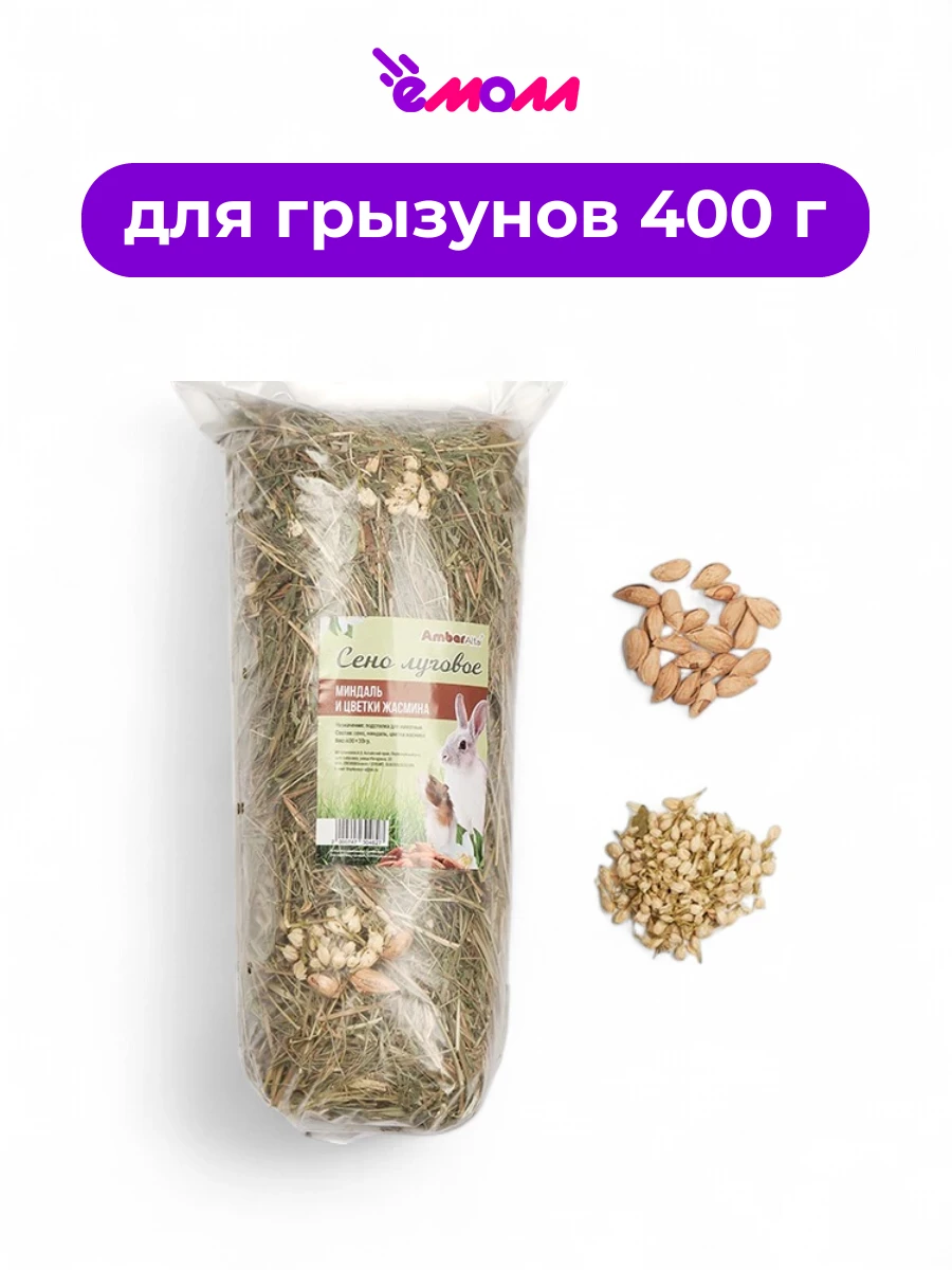 Сено "AmbarAltai" с миндалем и цветками жасмина — это высококачественный корм для грызунов, обогащенный натуральными добавками для поддержания здоровья и разнообразия рациона ваших питомцев. В отличие от других вариантов, это сено содержит уникальное сочетание миндаля и жасмина, что делает его особенно привлекательным для животных.