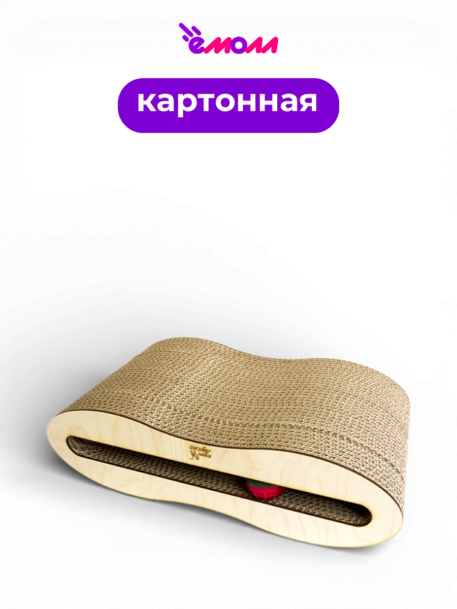 Компактная картонная когтеточка‑лежанка объединяет две функции: удобную поверхность для сна и игровую зону с игрушкой, наполненной кошачьей мятой, которая привлекает питомца и отвлекает от мебели.