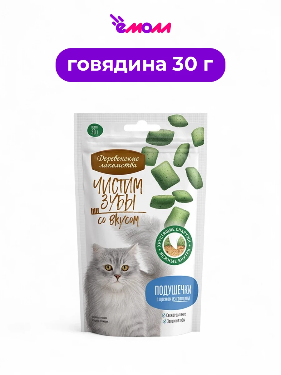 Деревенские лакомства подушечки для кошек с кремом из говядины Чистим зубы 30 г