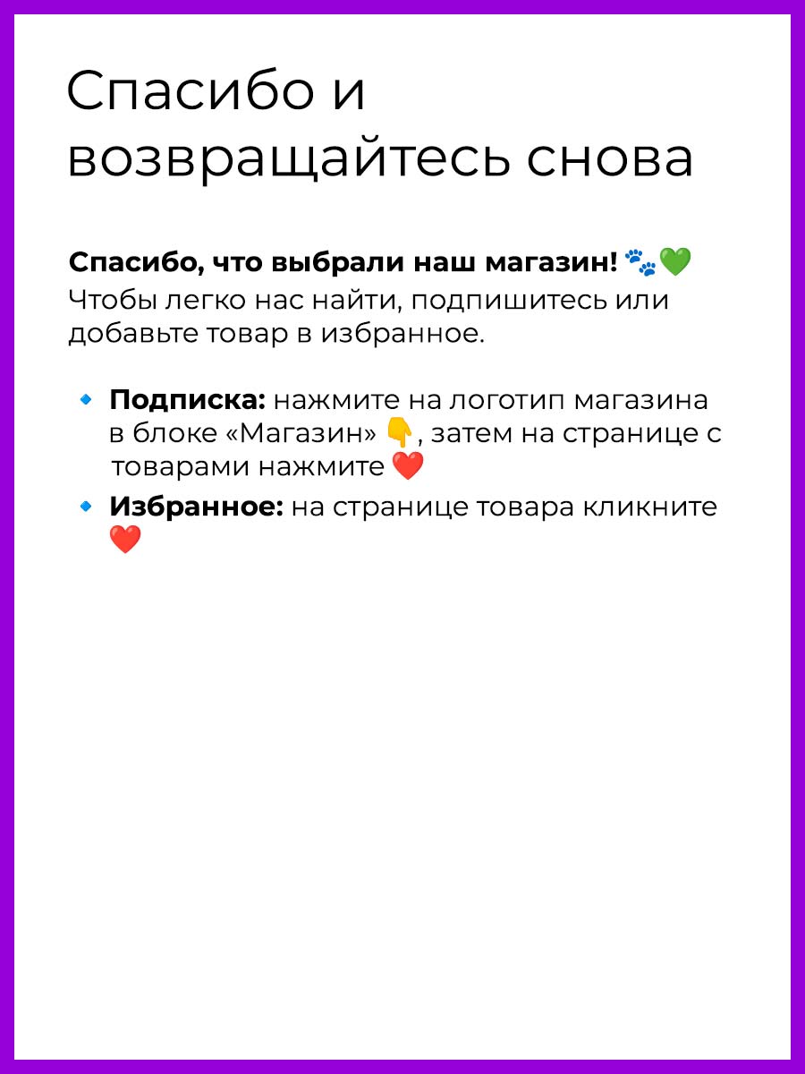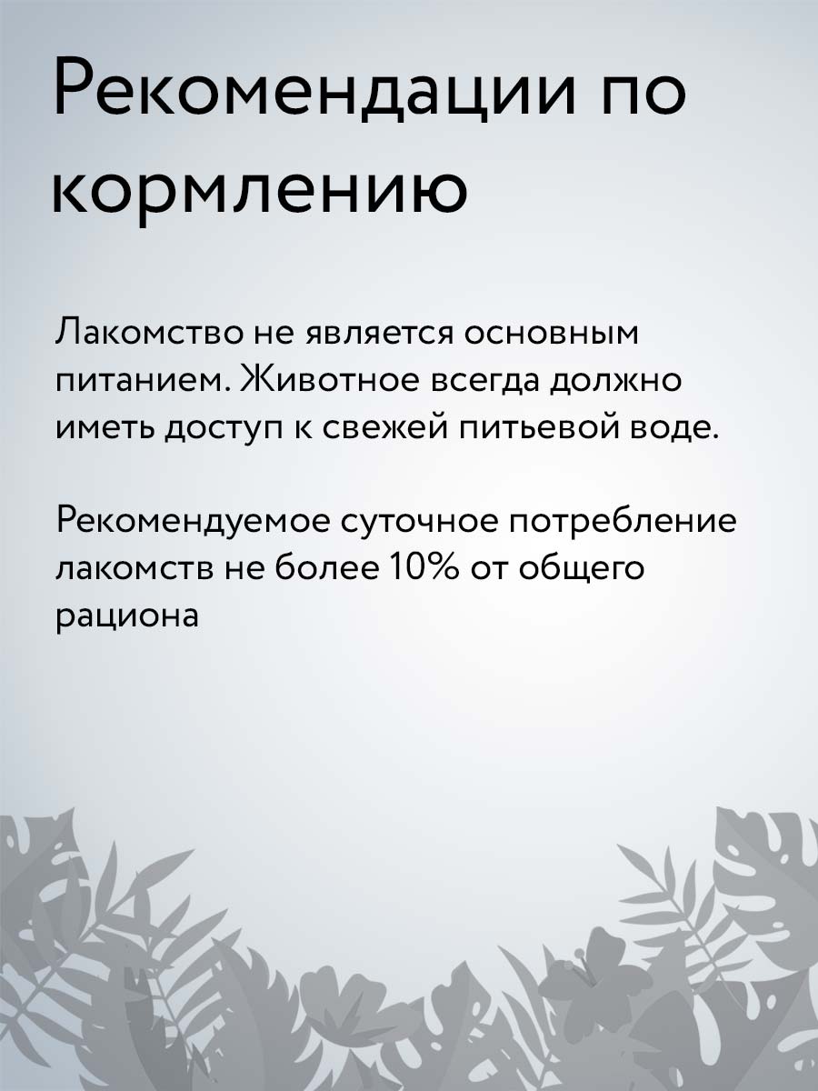 Лакомство не является основным питанием. Животное всегда должно иметь доступ к свежей питьевой воде. Рекомендуемое суточное потребление лакомств не более 10% от общего рациона
