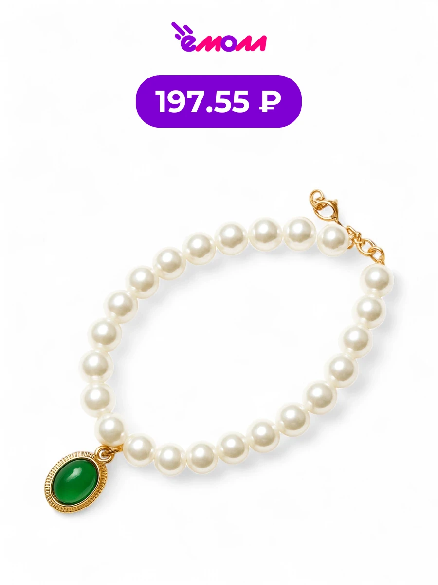 Декоративное ожерелье для питомцев, выполненное из белых бусин с жемчужным блеском. Украшение дополнено подвеской-медальоном овальной формы с зелёной вставкой в золотистой оправе. Оснащено металлическим карабином для удобного застёгивания и надёжной фиксации.