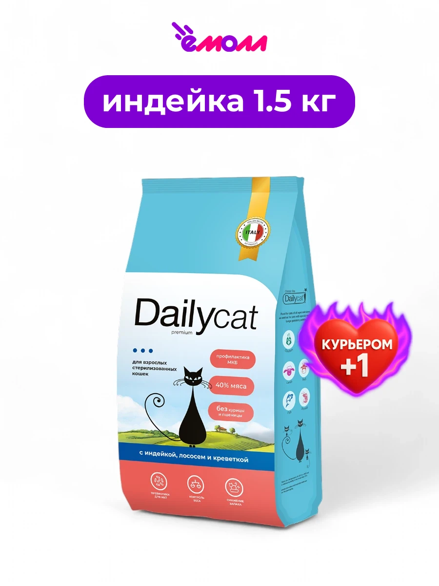 Dailycat сухой корм для стерилизованных кошек с индейкой, лососем и креветкой 1.5 кг