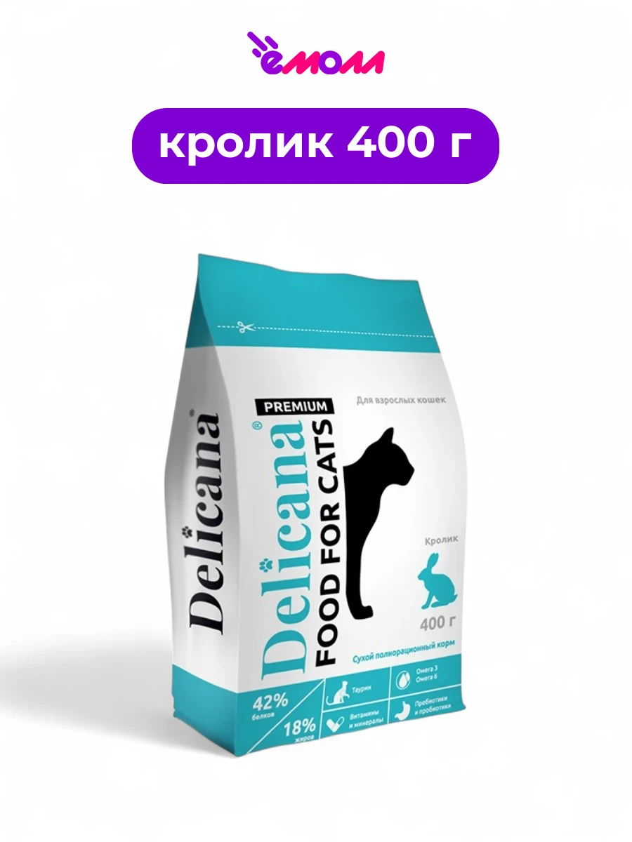 Delicana представляет сухой корм с кроликом для взрослых кошек, обеспечивающий полноценное и сбалансированное питание. Основным ингредиентом является дегидрированное мясо индейки (29%), дополненное гидролизатом белка кролика (4%), что гарантирует высокое содержание легкоусвояемого белка.