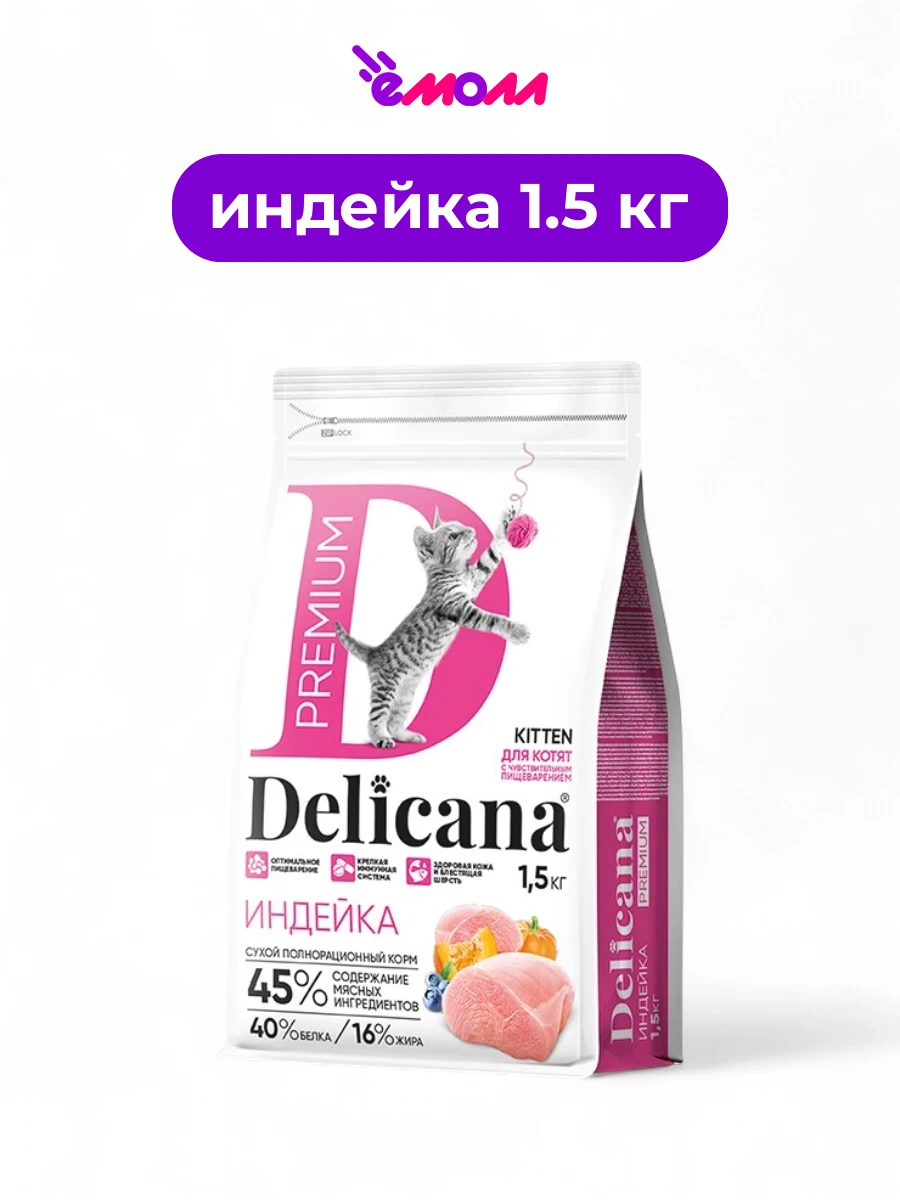 Delicana сухой корм для котят с чувствительным пищеварением с индейкой 1.5 кг