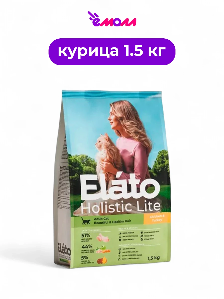 Elato корм для взрослых кошек для красивой и здоровой шерсти Holistic Lite курица индейка 1,5 кг