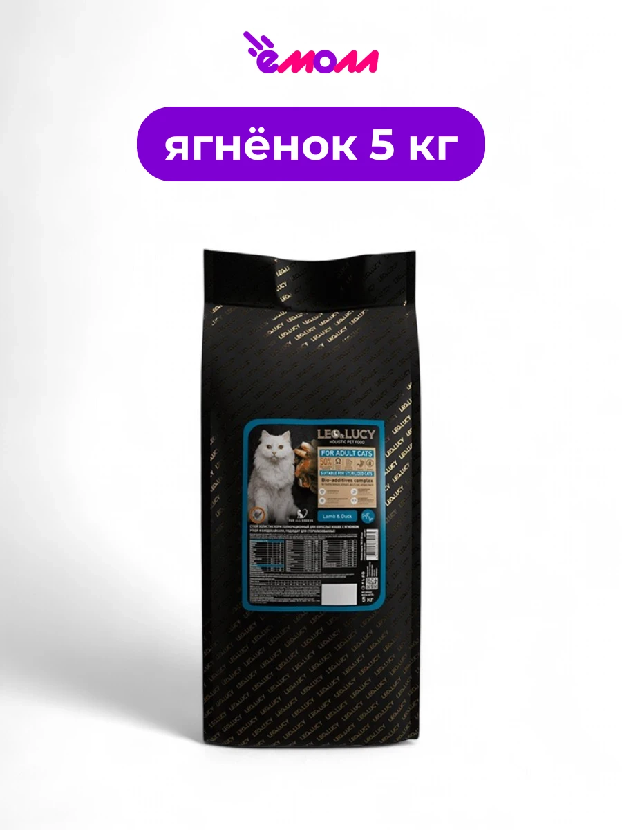 LEO&LUCY сухой корм для кошек холистик с ягненком уткой и биодобавками подходит для стерилизованных 5 кг