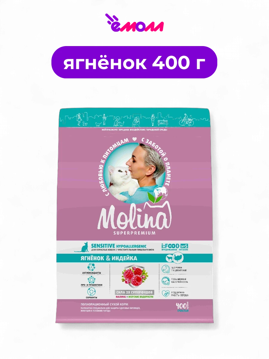 Molina сухой корм с ягненком и индейкой для взрослых кошек с чувствительным пищеварением Hypoallergenic 0.4 кг
