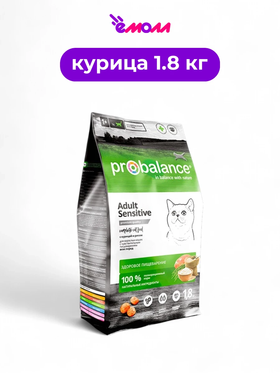 ProBalance Sensitive — это полнорационный сухой корм премиум-класса, специально разработанный для взрослых кошек всех пород с чувствительным пищеварением.