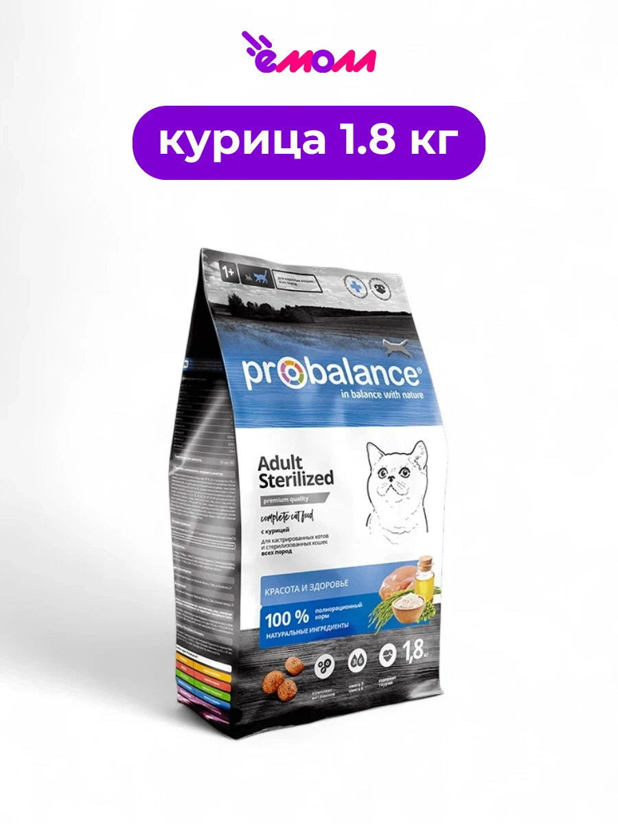 ProBalance Sterilized — это полнорационный сухой корм премиум-класса, специально разработанный для стерилизованных кошек и кастрированных котов. Учитывая изменения в метаболизме после стерилизации, этот корм помогает поддерживать оптимальный вес питомца и снижает риск развития мочекаменной болезни.