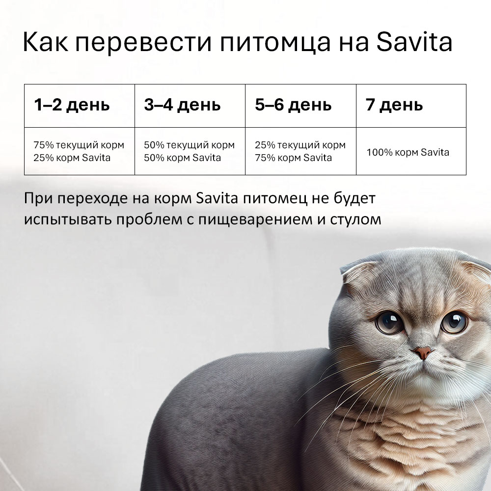 Корм Savita класса холистик для взрослых кошек представляет собой полноценную и уравновешенную пищу, включающую в себя все необходимые витамины и минералы, которые нужны кошке для поддержания здоровья после происходящих в ее теле изменений.