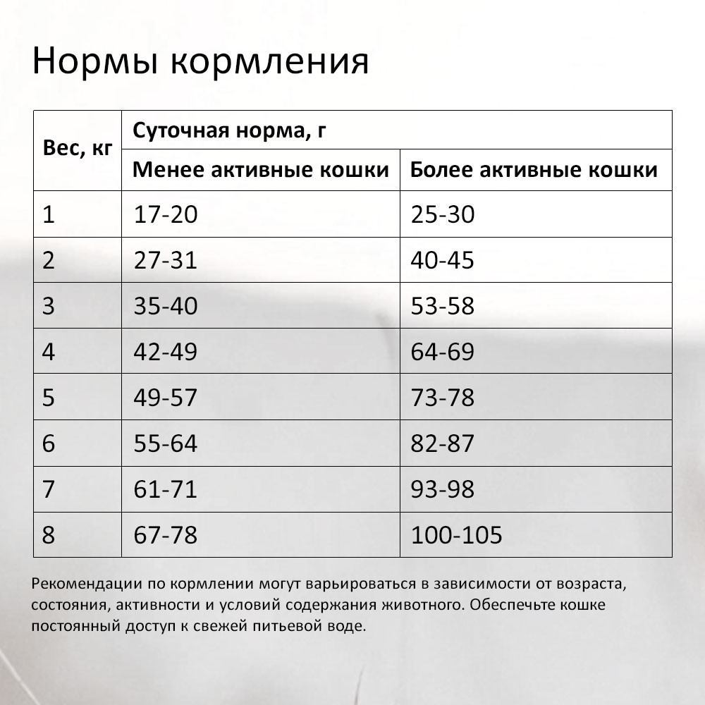 Рекомендации по кормлении могут варьироваться в зависимости от возраста, состояния, активности и условий содержания животного. Обеспечьте кошке постоянный доступ к свежей питьевой воде.