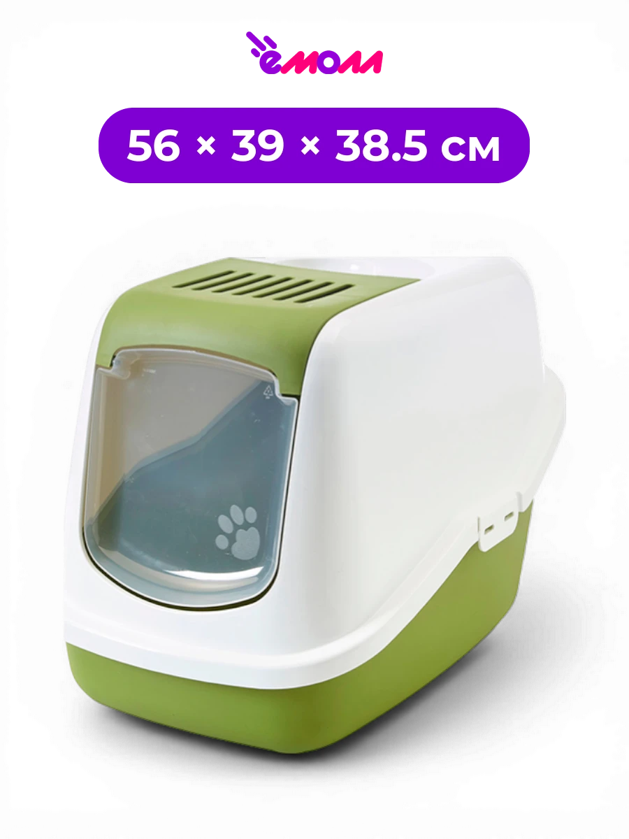 В крышку встроен сменный угольный фильтр для контроля запаха. Переносить туалет удобно благодаря ручке на верхней части корпуса. Прозрачная распашная дверца открывается в обе стороны, а на период приучения переднюю панель можно оставлять открытой, если питомцу нужно время привыкнуть к закрытому формату.