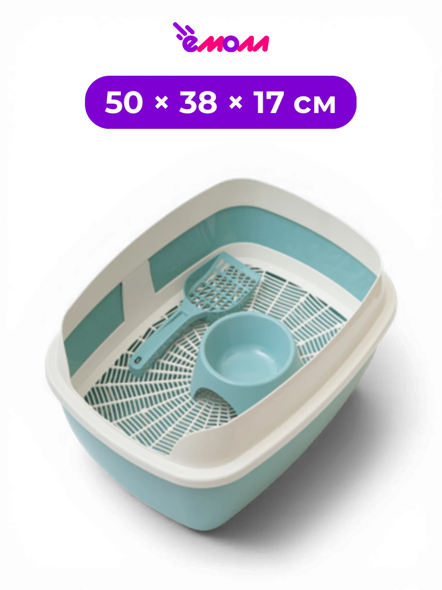 В набор входят: просторный лоток с высоким съемным бортом и сеткой (можно использовать с наполнителем или без него, чтобы лапки оставались сухими), совок для уборки и миска объемом 300 мл для воды или корма.