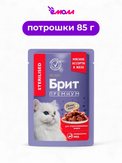 BRIT PREMIUM пауч для взрослых стерилизованных кошек Мясное ассорти с потрошками в желе 85 г