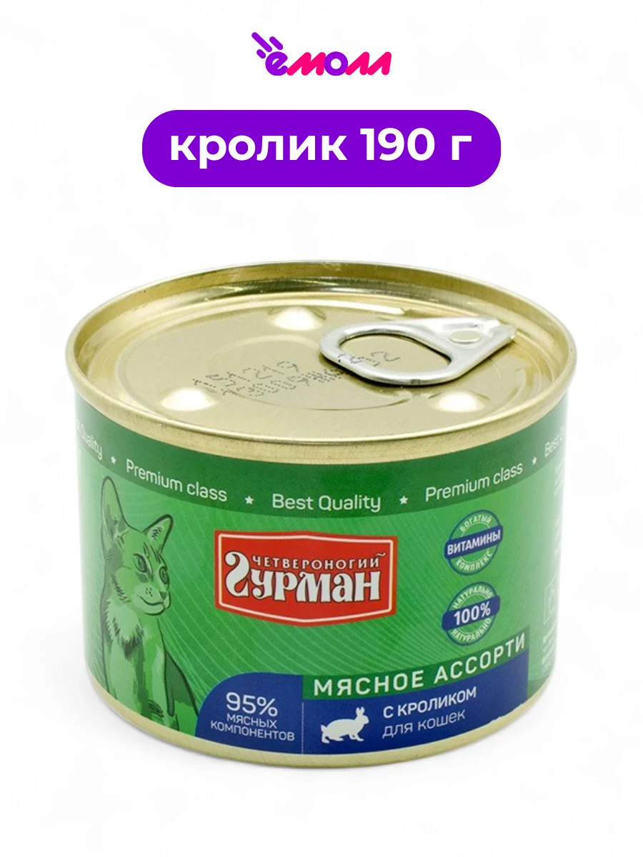 Четвероногий Гурман "Мясное ассорти" с кроликом — это премиальный влажный корм для кошек, содержащий 95% высококачественных мясных компонентов. Основу рациона составляет мясо кролика (не менее 10%), дополненное курицей, сердцем и печенью, что обеспечивает насыщенный вкус и аромат, привлекающий даже самых привередливых питомцев.