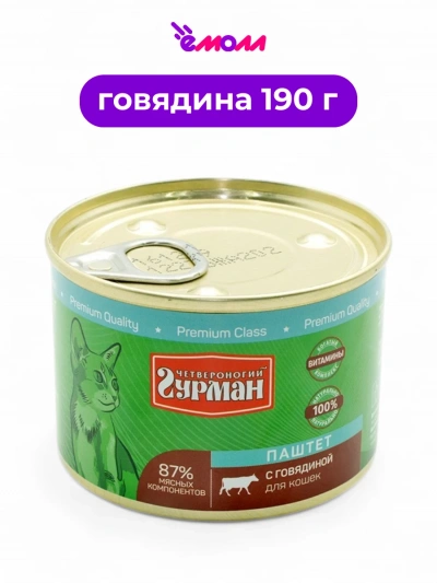 Четвероногий Гурман представляет влажный корм премиум-класса для кошек — паштет с говядиной. Этот продукт отличается высоким содержанием мясных компонентов (87%), обеспечивая питомцу полноценное и сбалансированное питание.