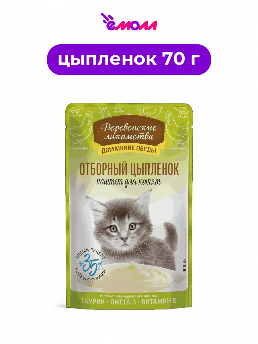 Консервированный корм «Деревенские лакомства — Домашние обеды» разработан специально для котят. Мягкий паштет из мяса цыплёнка подходит даже самым маленьким пушистикам.