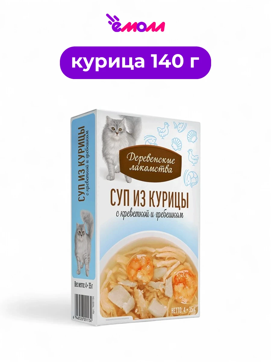 Деревенские лакомства суп для кошек из курицы с креветкой и гребешком пауч 4 шт по 35 г