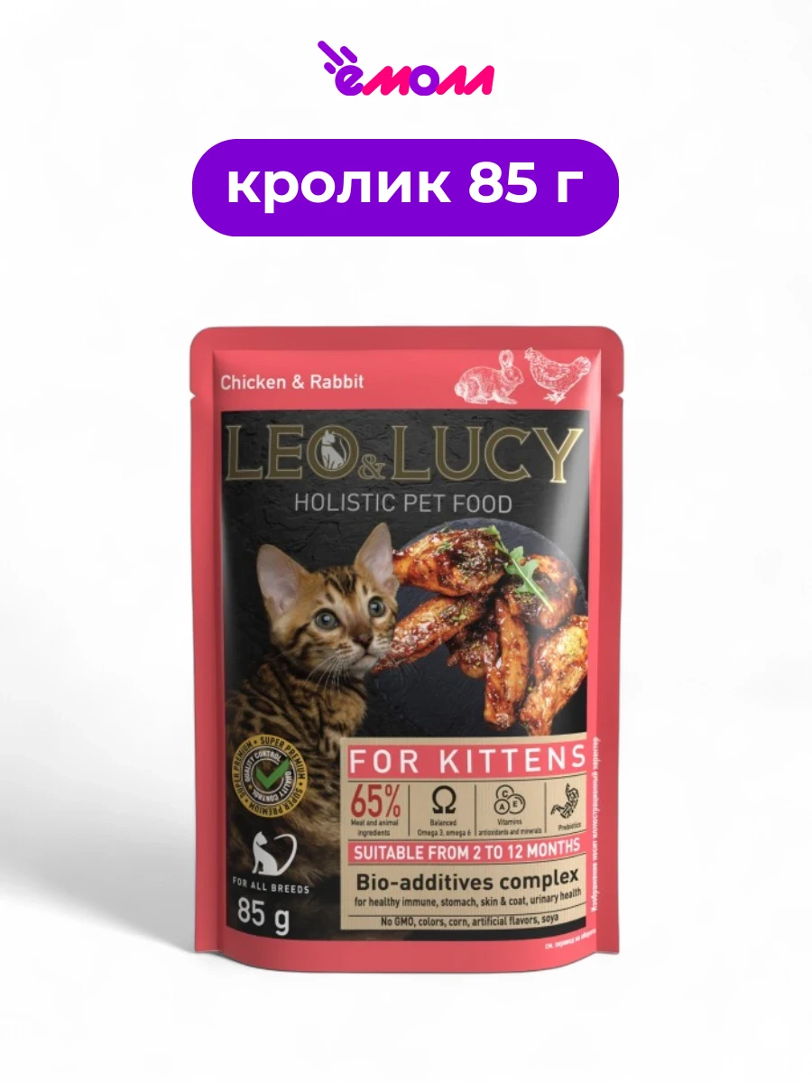 LEO&LUCY холистик влажный корм для котят кусочки в соусе с кроликом курицей и биодобавками 85 г