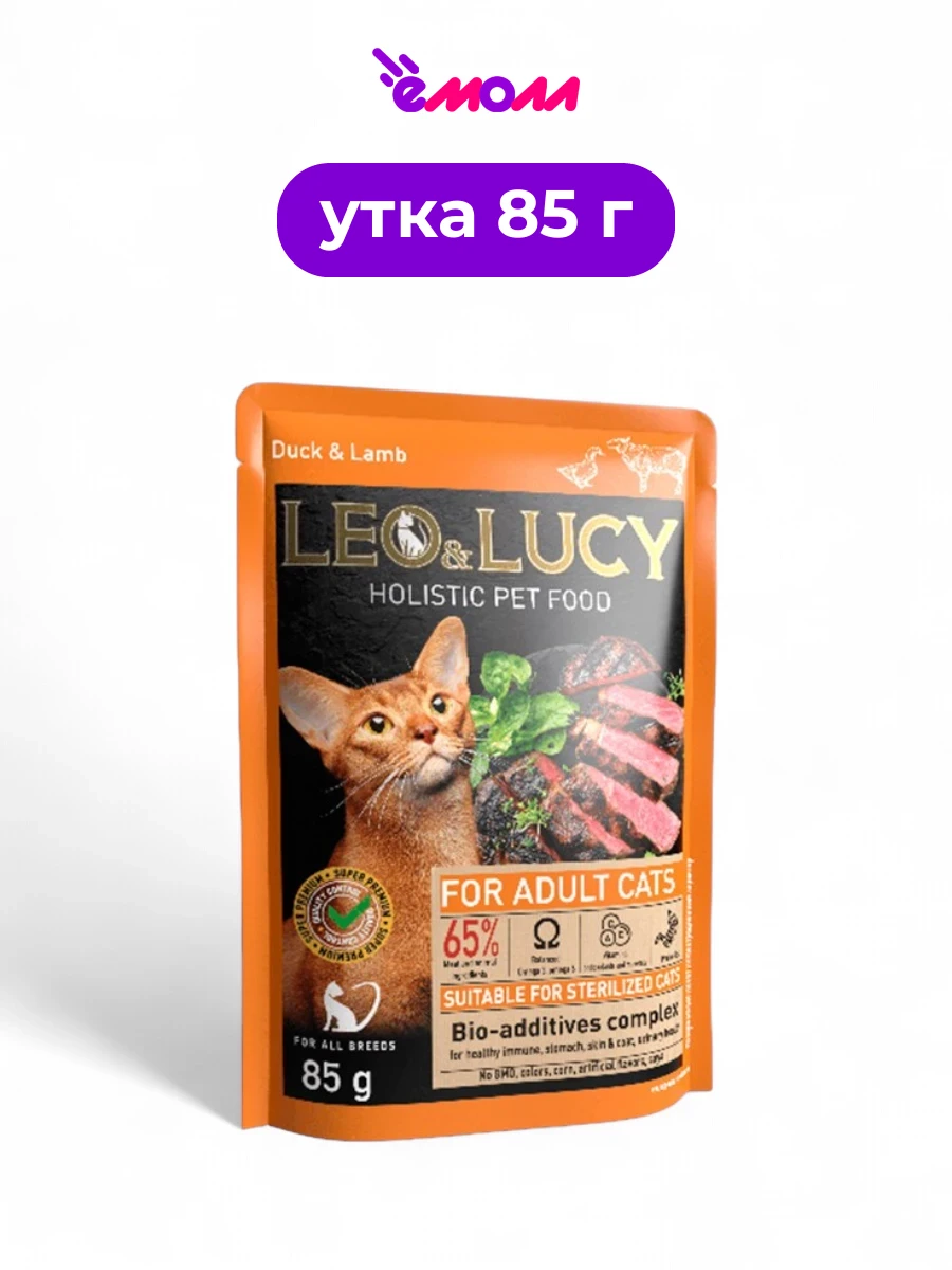 LEO&LUCY влажный корм для кошек холистик Кусочки в соусе с уткой ягненком и биодобавками подходит для стерилизованных 85 г