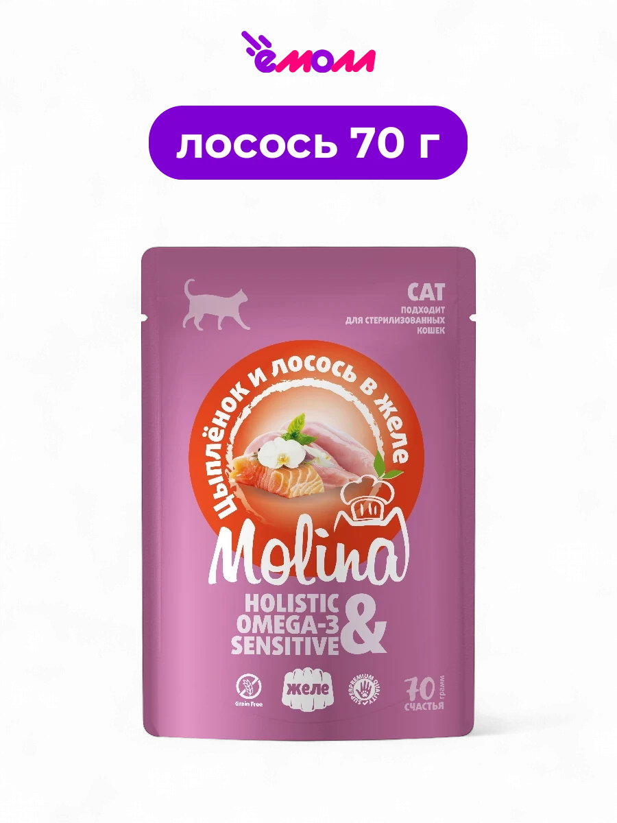 Molina пауч для взрослых кошек цыпленок и лосось в желе 70 г