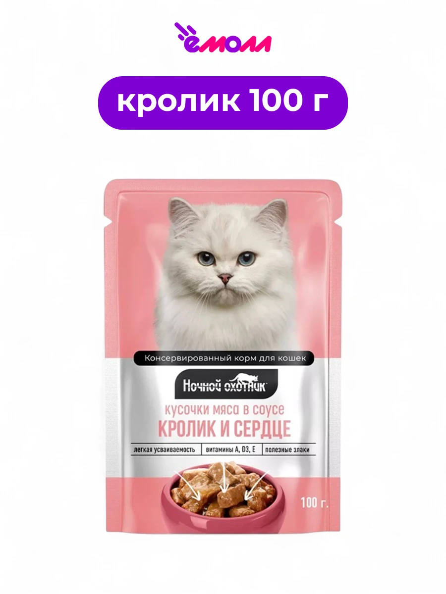 Влажный корм для кошек «Ночной охотник» с кроликом и сердцем в соусе — это сбалансированное питание, разработанное для удовлетворения потребностей взрослых кошек всех пород.