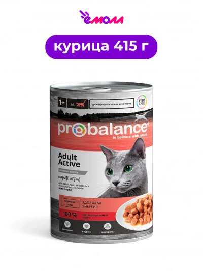 ProBalance Active — это полнорационный консервированный корм премиум-класса, специально разработанный для взрослых кошек всех пород, ведущих активный образ жизни. Этот корм обеспечивает питомца всеми необходимыми питательными веществами, поддерживая его здоровье и энергию.