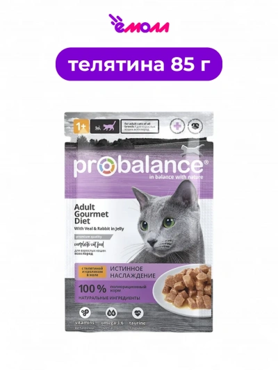 ProBalance Gourmet Diet с телятиной и кроликом в желе — это полнорационный влажный корм премиум-класса, разработанный специально для привередливых кошек. Благодаря сочетанию натуральных ингредиентов и отсутствию искусственных добавок, этот корм обеспечивает сбалансированное питание для вашего питомца.