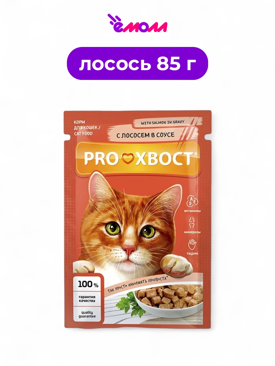 Влажный корм для кошек PROХВОСТ с лососем в соусе — это сбалансированное питание, разработанное для ежедневного рациона взрослых кошек всех пород.
