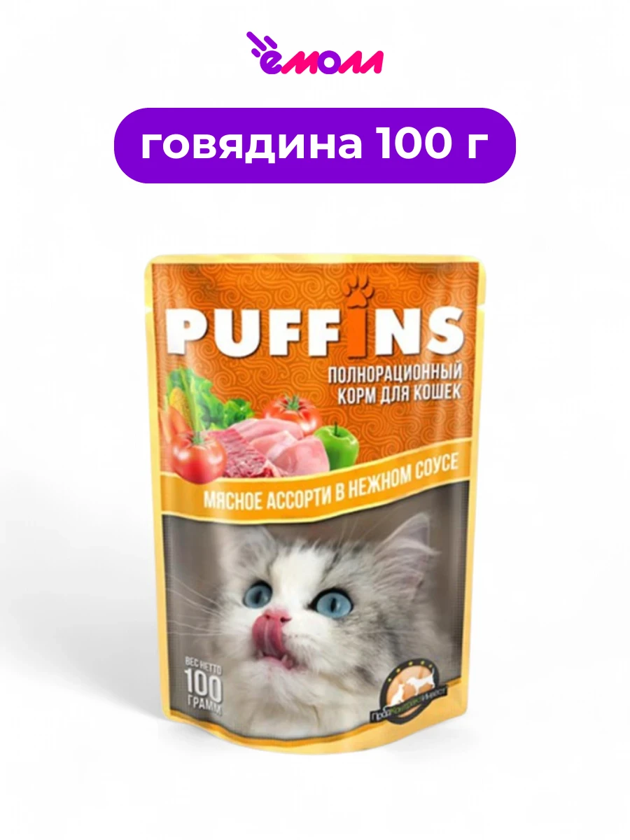 Влажный корм для кошек PUFFINS с мясным ассорти в соусе — это полнорационное питание, разработанное для удовлетворения потребностей взрослых кошек.