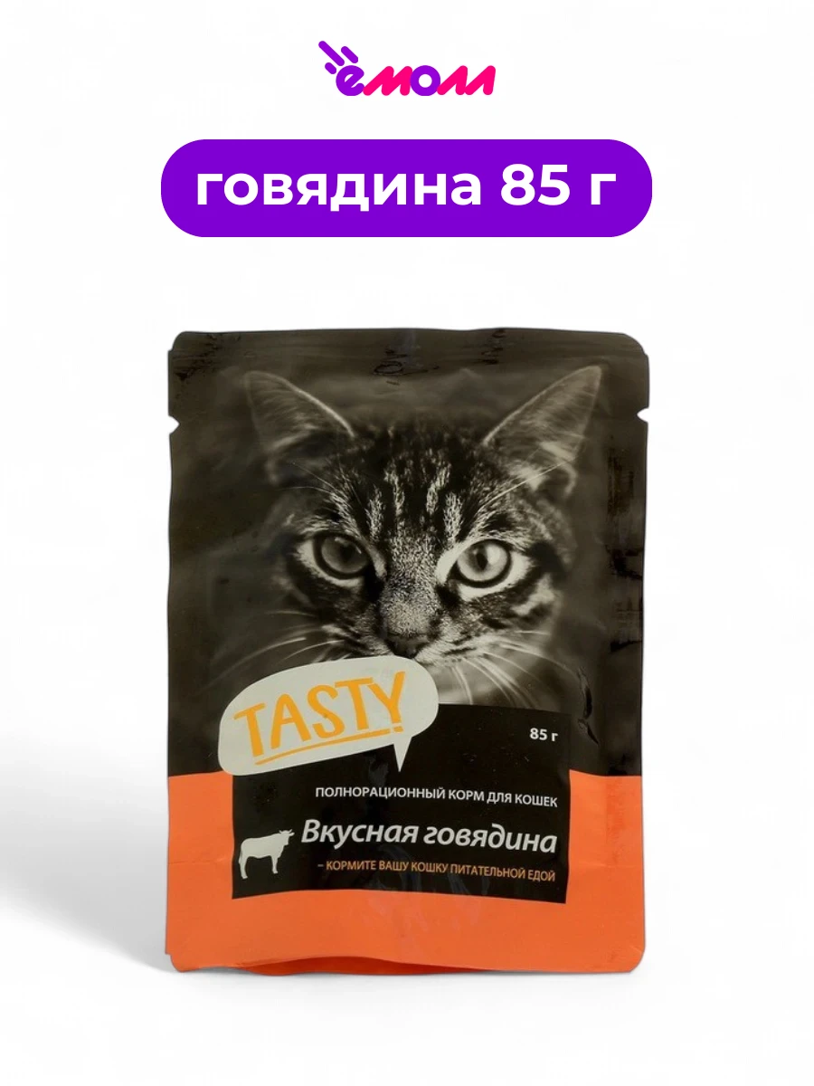 В отличие от других моделей линейки Tasty, этот вариант содержит говядину, которая является богатым источником белка, микро- и макроэлементов, способствующих поддержанию мышечной массы и общего здоровья кошки.