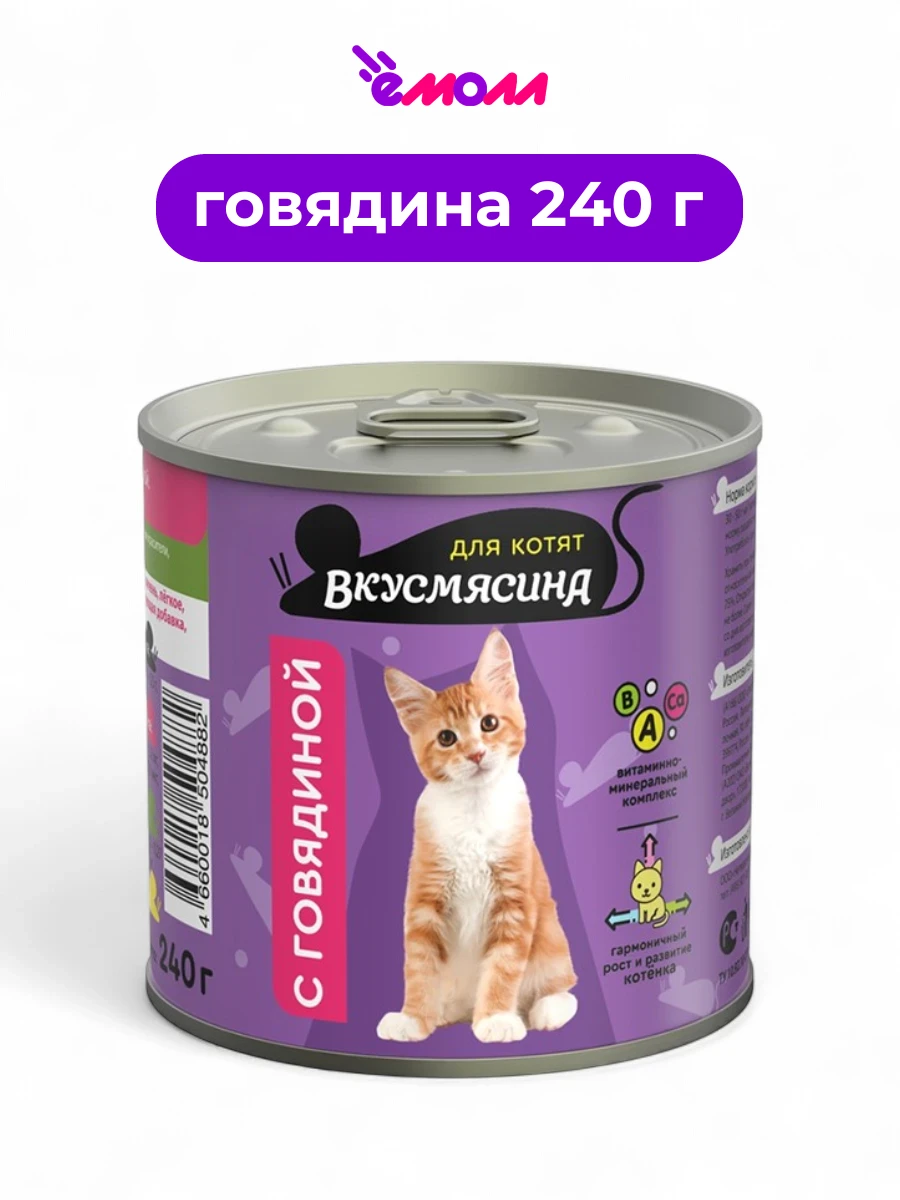 Влажный корм ВКУСМЯСИНА с говядиной разработан специально для котят всех пород, обеспечивая им полноценное и сбалансированное питание.