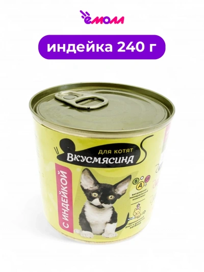 ВКУСМЯСИНА 240 г для котят с индейкой — это полнорационный влажный корм, специально разработанный для удовлетворения потребностей растущих котят.