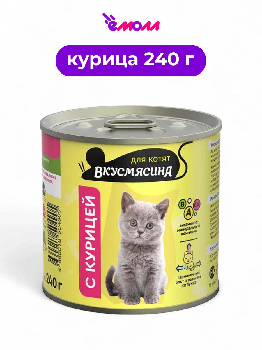 Влажный корм ВКУСМЯСИНА с курицей в банке 240 г разработан специально для котят всех пород, обеспечивая им полноценное и сбалансированное питание.