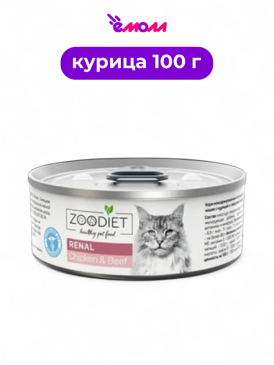 Zoodiet консервы для кошек с курицей и говядиной для поддержания функции почек 100 г