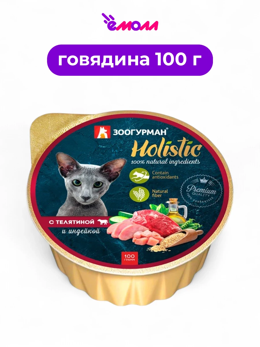 Зоогурман консервированный корм для кошек Holistic с телятиной и индейкой ламистер 100 г