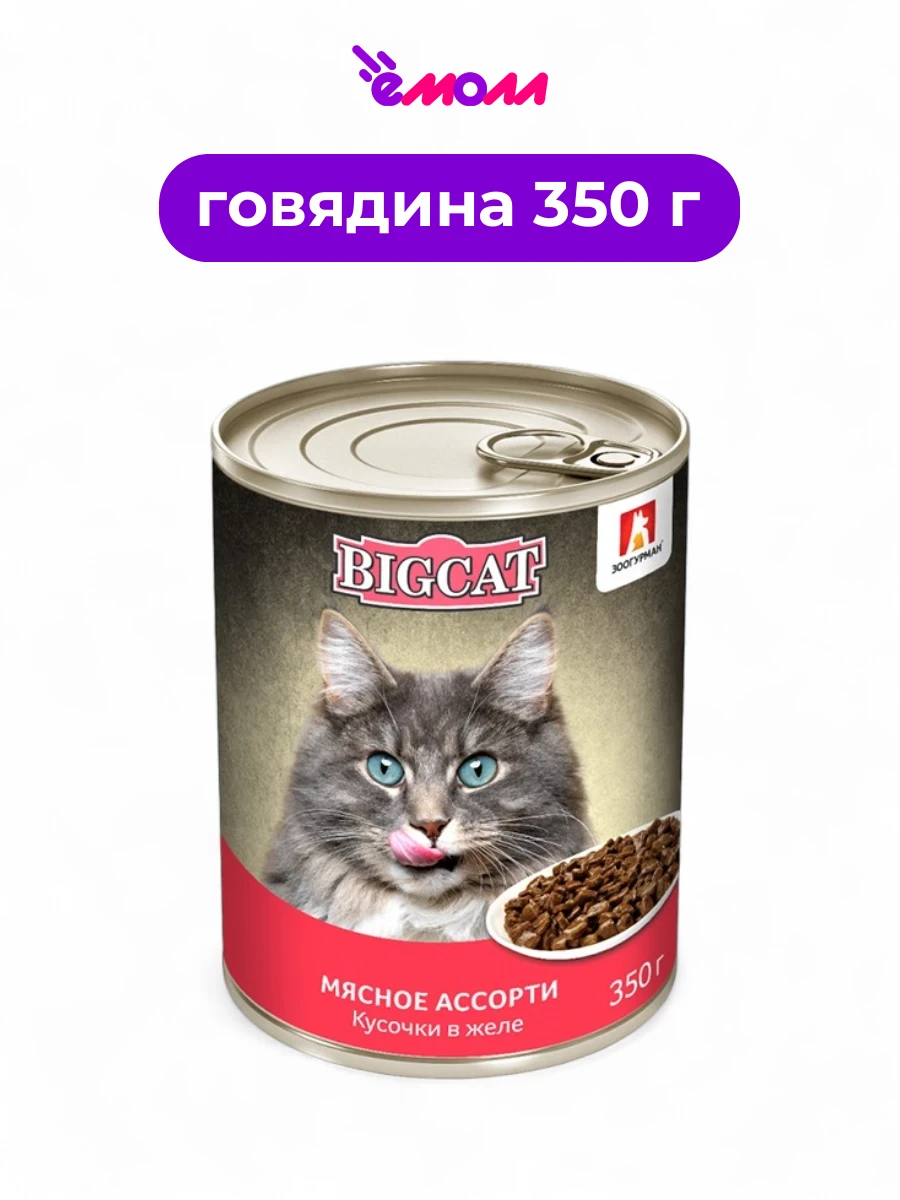 BIG CAT — влажный корм для кошек на основе натурального мяса. Нежные аппетитные кусочки в желе придутся по вкусу самым требовательным питомцам.