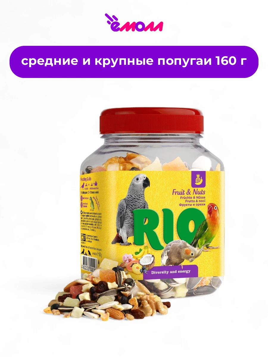 Вкусная и полезная фруктово-ореховая смесь состоит из натуральных сушеных фруктов, хрустящих орехов, ягод и семян, и придется по вкусу средним и крупным попугаям.