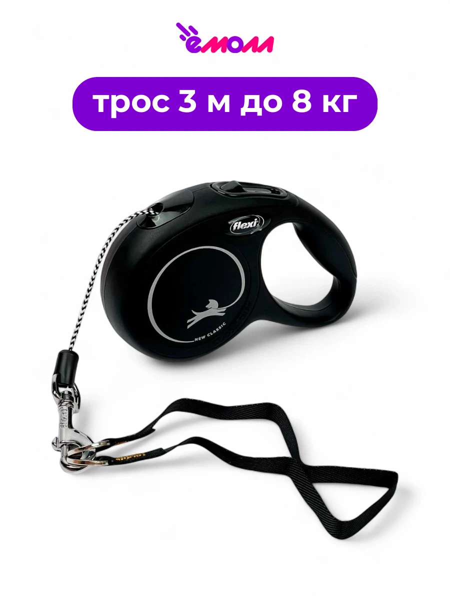 Flexi поводок-рулетка трос для собак New Classic XS черный до 8 кг, 3 м