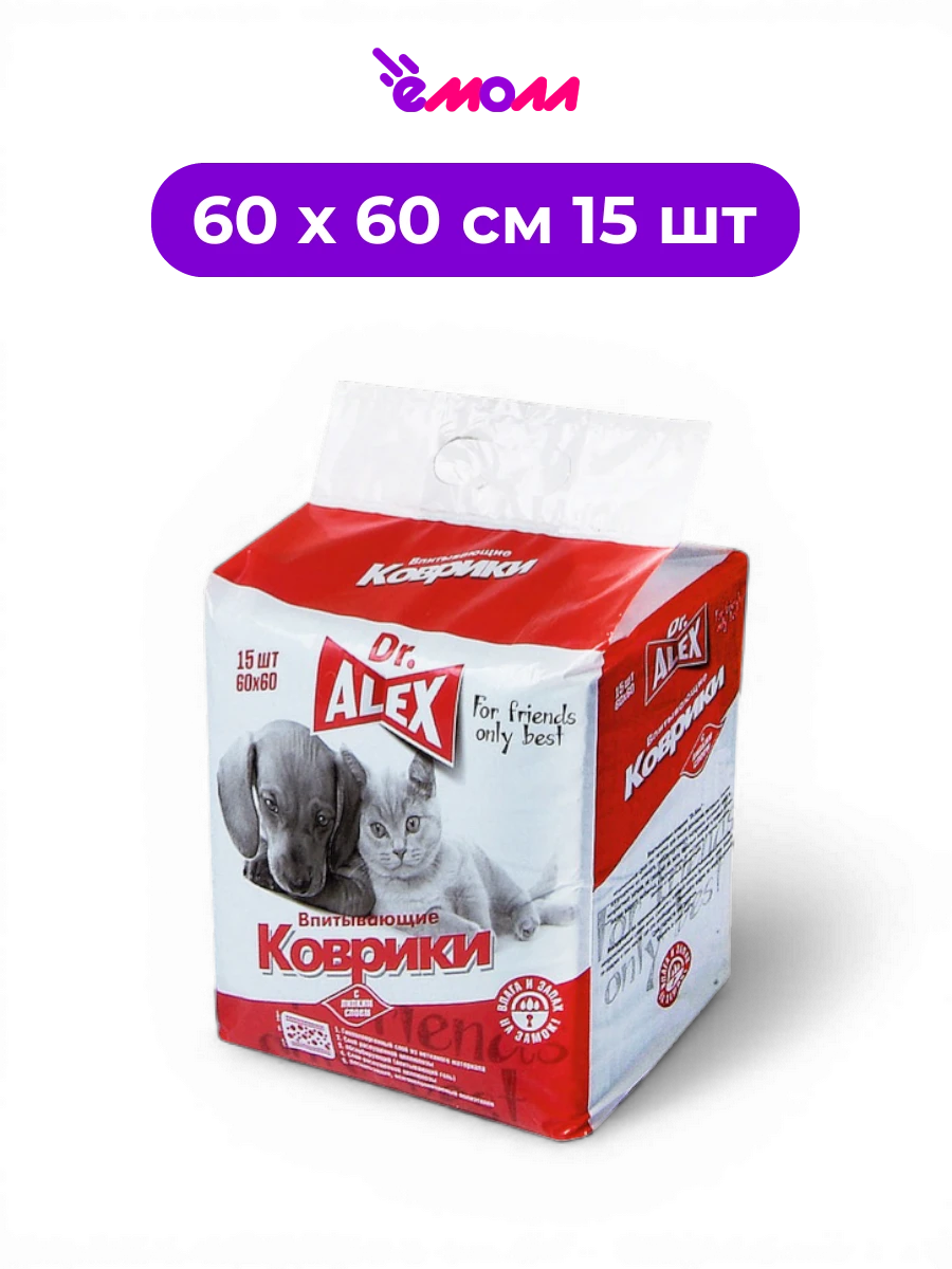 ДОКТОР АЛЕКС пелёнки одноразовые впитывающие для животных с нейтрализацией запаха 60 х 60 см 15 шт