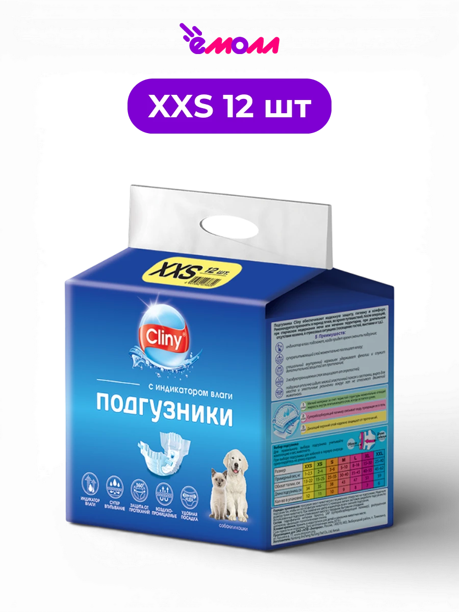 CLINY подгузники одноразовые для собак и кошек размер XXS от 1 до 2.5 кг 12 шт