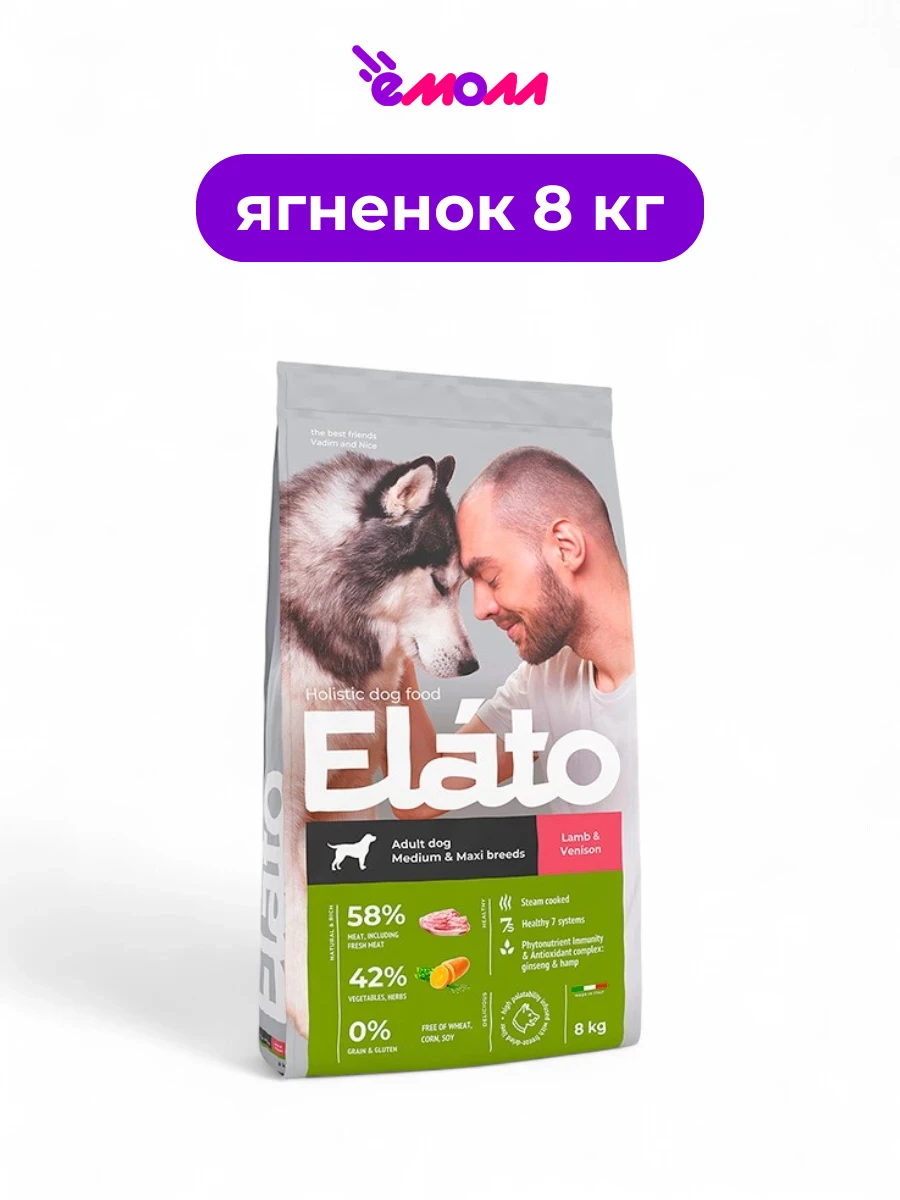 Elato корм для взрослых собак средних и крупных пород Holistic с ягненком и олениной 8 кг