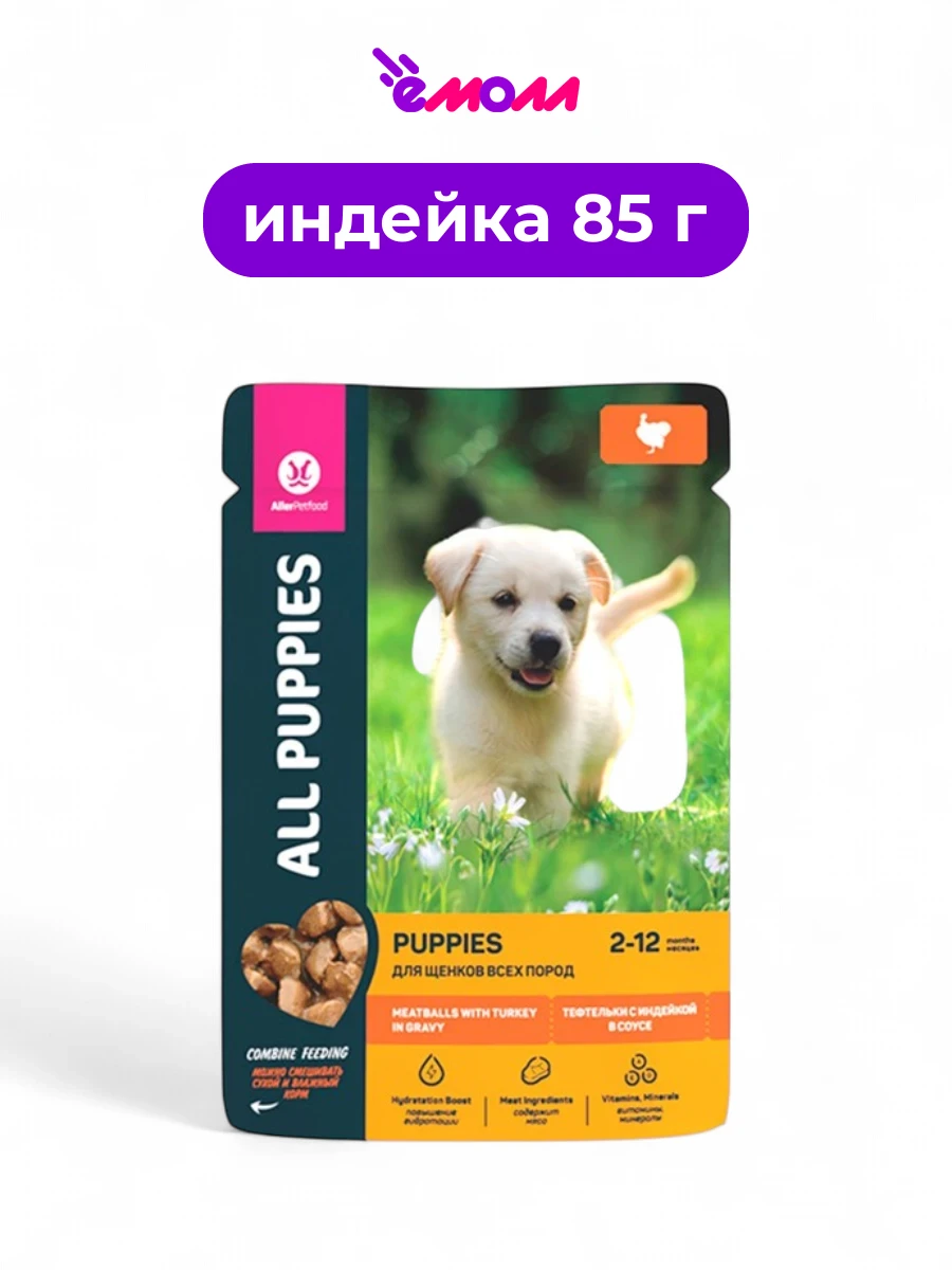 Консервированный премиальный корм ALL PUPPIES «Тефтельки с индейкой в соусе» предназначен для щенков всех пород, а также для беременных и кормящих собак. Этот влажный корм разработан с учетом последних исследований в области питания домашних животных и соответствует международным стандартам (AAFCO/FEDIAF).