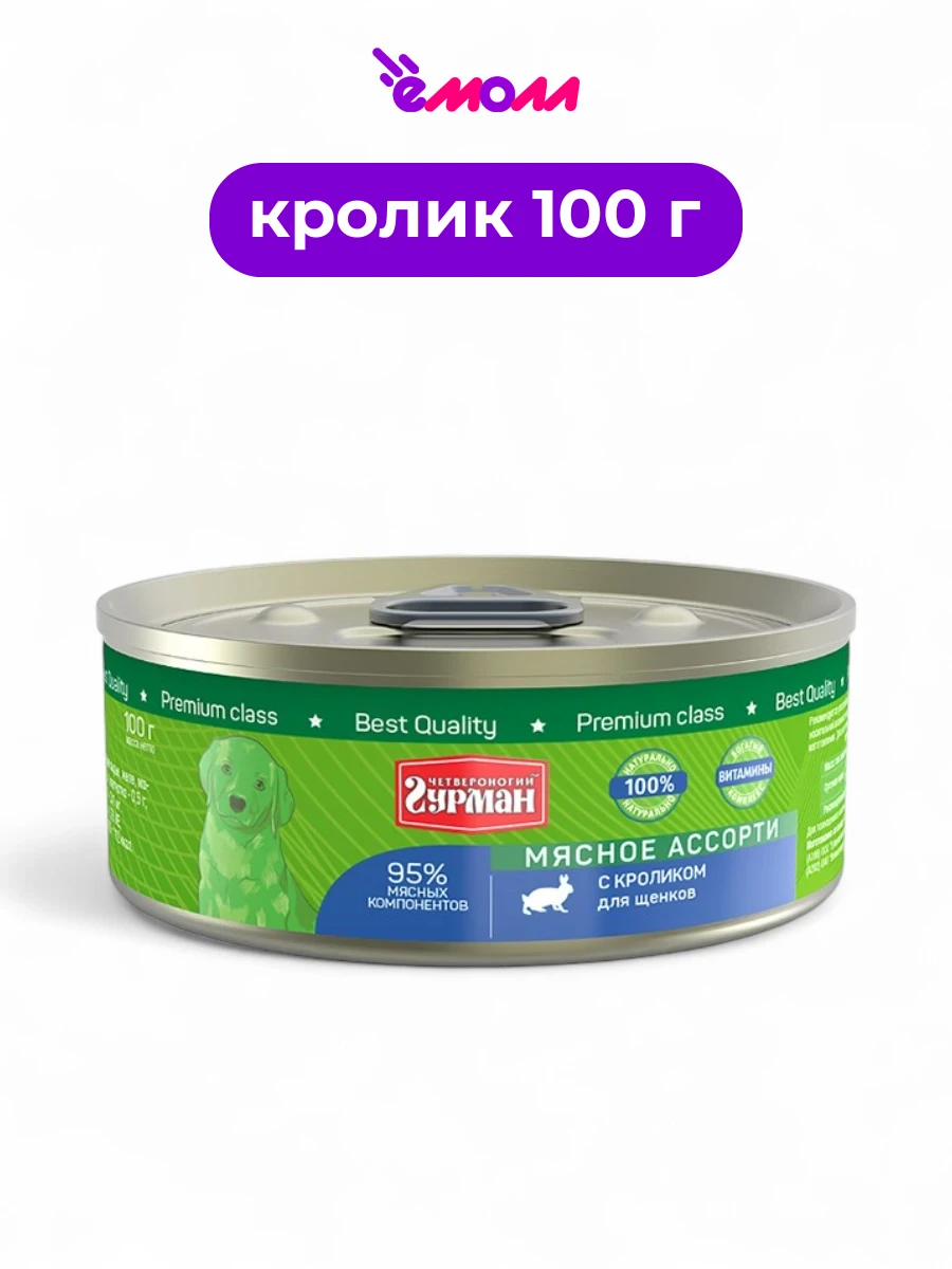Четвероногий Гурман предлагает влажный корм премиум-класса для щенков с кроликом. Продукт содержит 95% мясных компонентов, включая мясо кролика и курицы, а также субпродукты: сердце, легкое, рубец и печень.