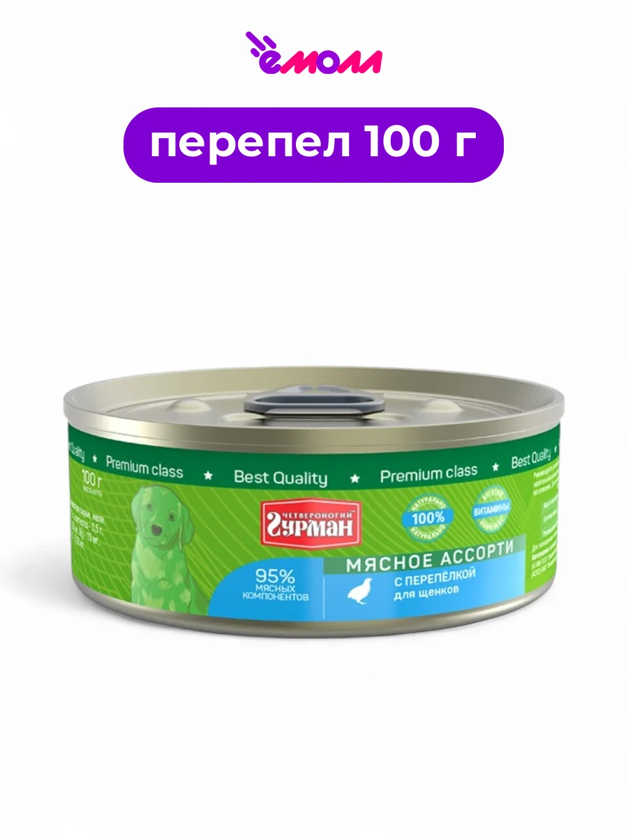 Консервы «Четвероногий Гурман» с перепелкой для щенков — это полнорационный влажный корм премиум-класса, разработанный специально для растущих собак.