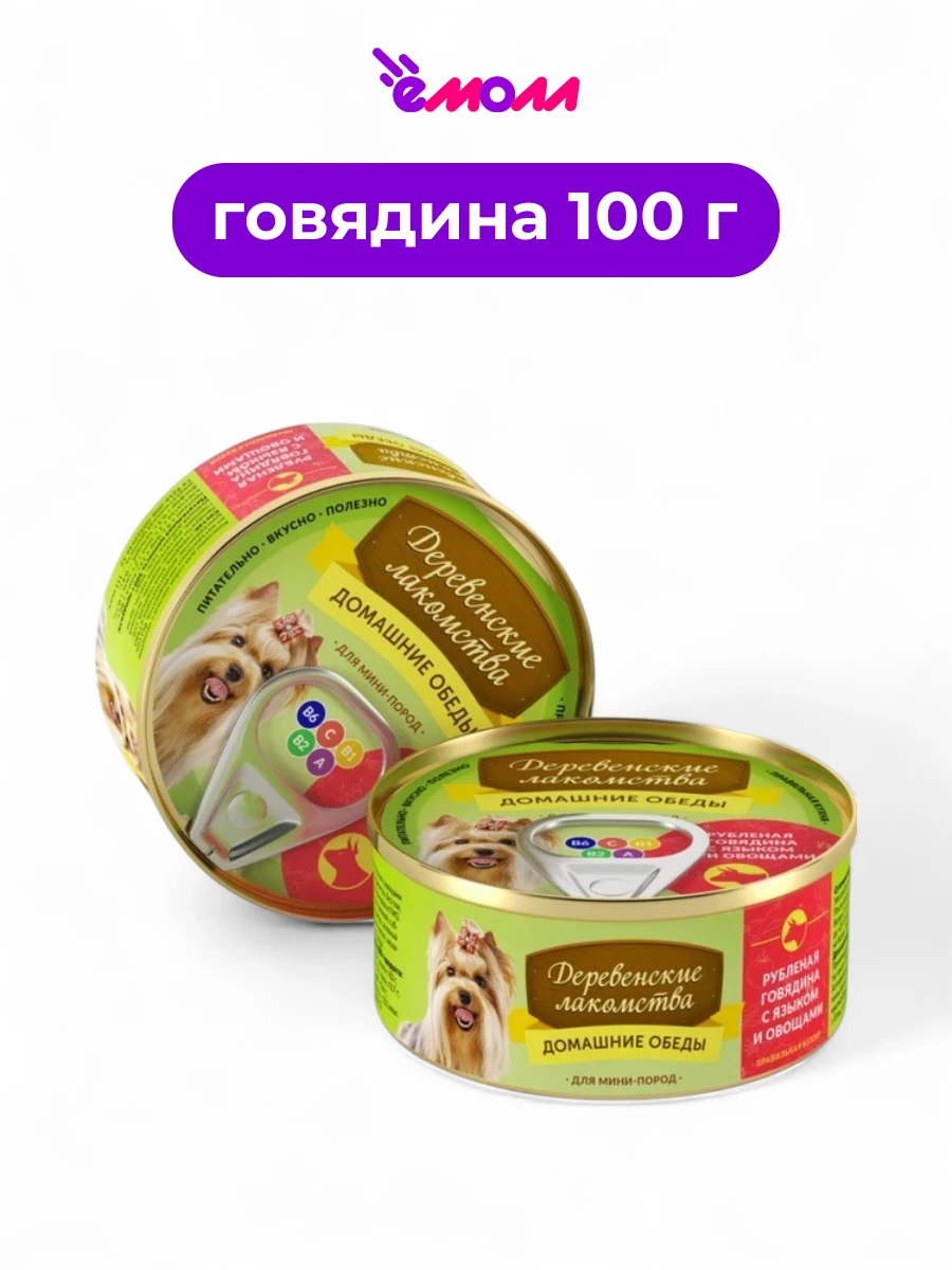 Консервы «Домашние обеды» от «Деревенских лакомств» с рубленой говядиной, языком и овощами — это сбалансированное питание, специально разработанное для собак миниатюрных пород. В отличие от других моделей, этот продукт сочетает в себе отборные кусочки свежей говядины и нежного отварного языка, дополненные зелёным горошком и молодой морковью, что обеспечивает богатый вкус и высокую питательную ценность.