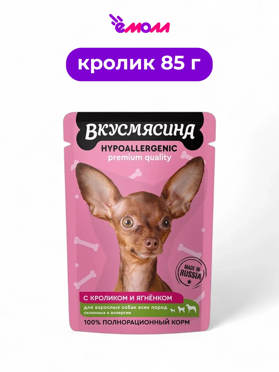 Влажный корм для собак «ВКУСМЯСИНА» с кусочками кролика и ягнёнка в соусе — это полнорационный гипоаллергенный продукт, разработанный с учётом потребностей собак всех пород.