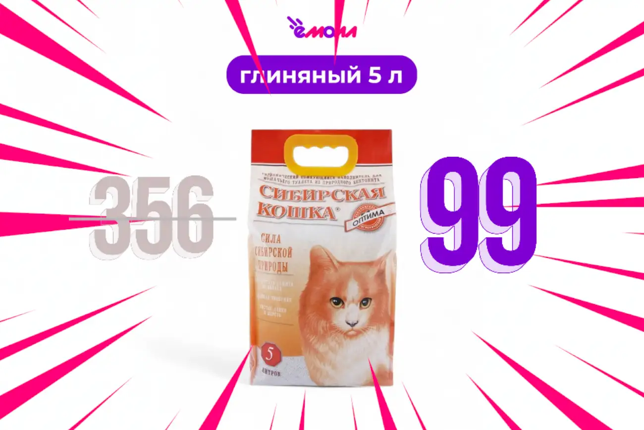 - В акции участвует товар: «Сибирская кошка, наполнитель для кошачьего туалета, комкующийся Оптима, 5 л».